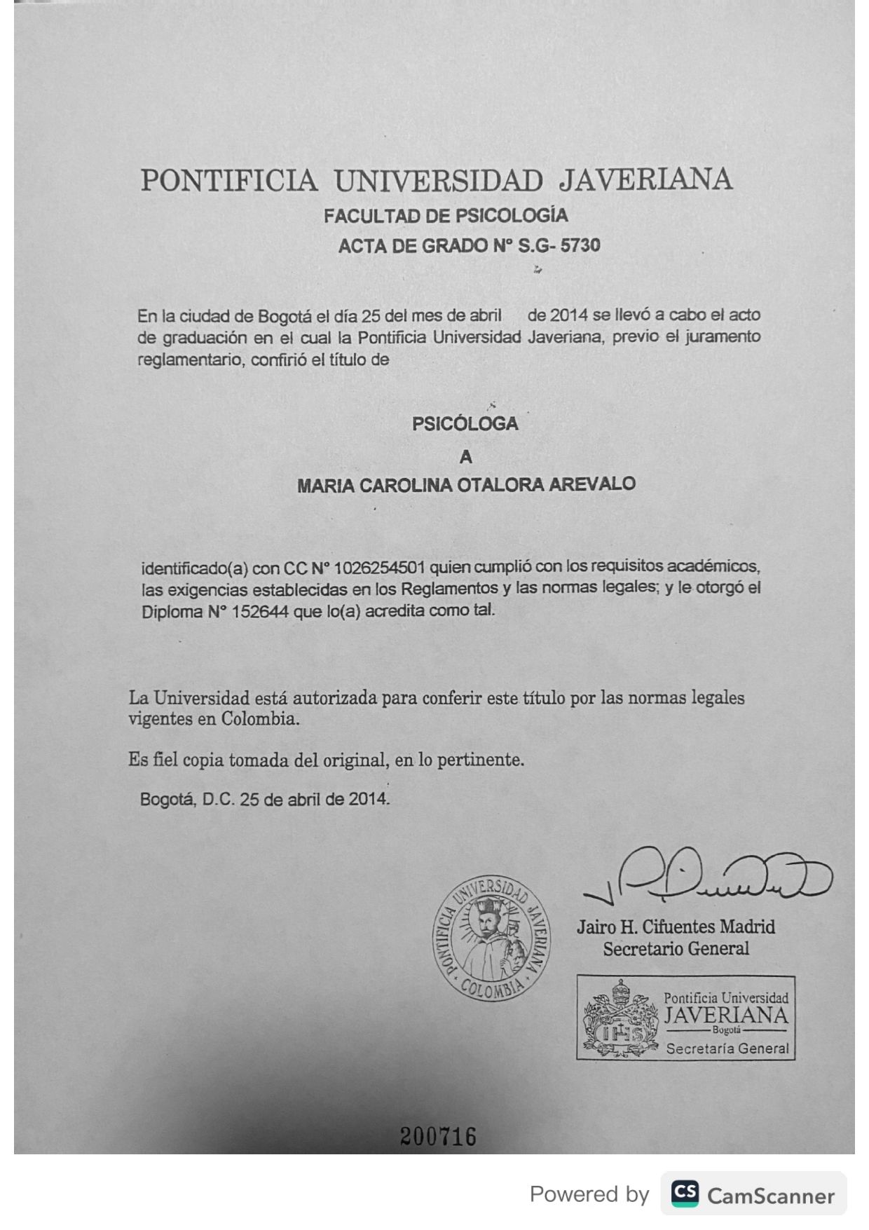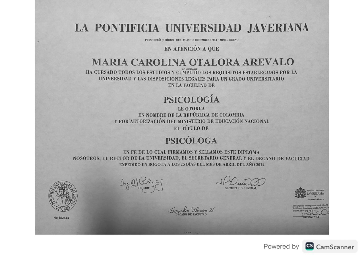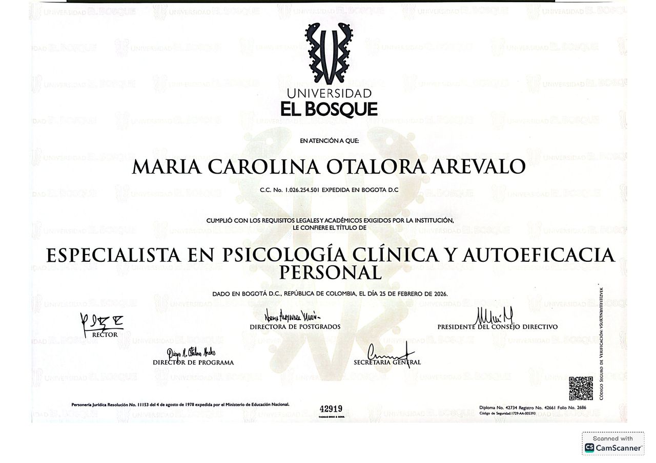 Psicóloga de la Universidad Javeriana con especialización en Psicología Clínica y Autoeficacia Personal de la Universidad El Bosque. Acompaño procesos terapéuticos enfocados en el manejo de dificultades emocionales, regulación de emociones y situaciones como ansiedad, depresión, duelos, toma de decisiones, entre otros.